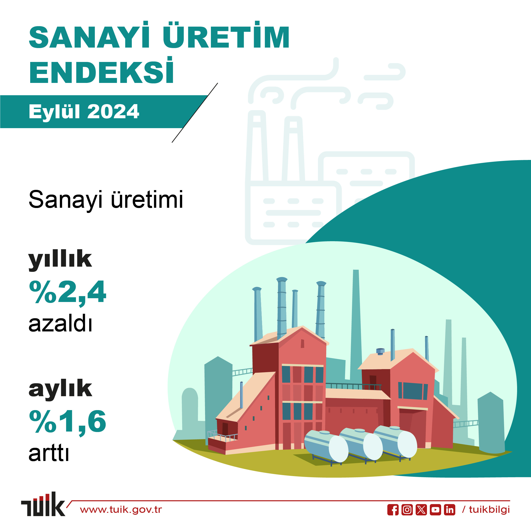 TÜİK, Eylül 2024 dönemine ilişkin sanayi üretim endeksi verilerini açıkladı. Buna göre; sanayi üretimi eylül ayında bir önceki yılın aynı ayına göre yüzde 2,4 azaldı. Sanayinin alt sektörleri incelendiğinde, madencilik ve taş ocakçılığı sektörü endeksi bir önceki yılın aynı ayına göre yüzde 5,3 azaldı, imalat sanayi sektörü endeksi yüzde 2,5 azaldı ve elektrik, gaz, buhar ve iklimlendirme üretimi ve dağıtımı sektörü endeksi yüzde 1,1 arttı.