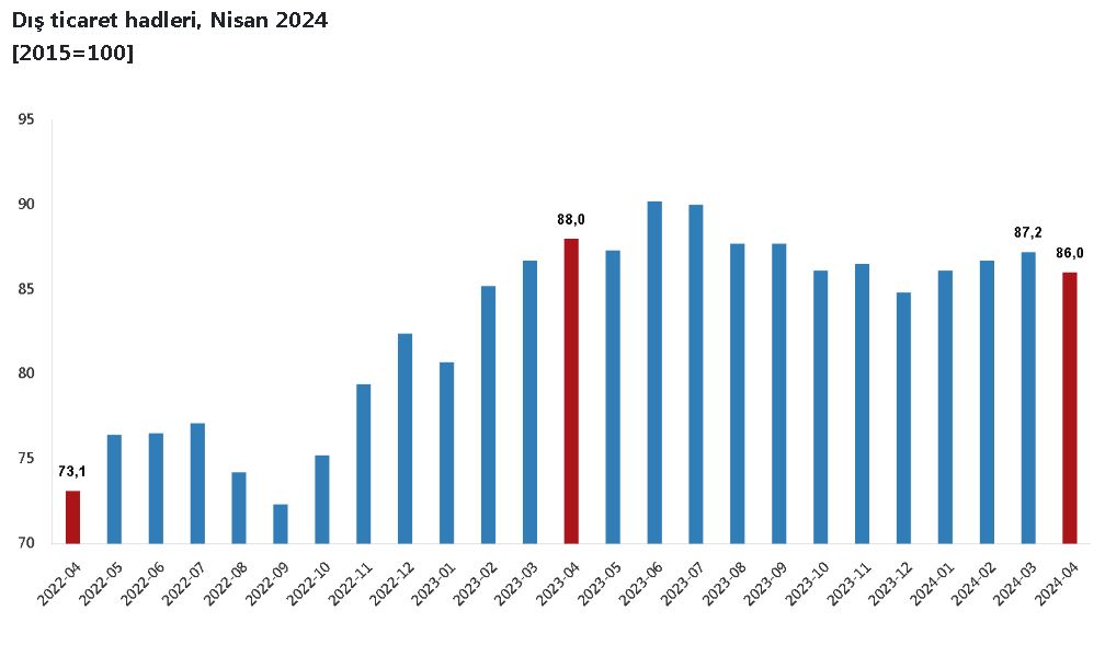 İhracat birim değer endeksinin ithalat birim değer endeksine bölünmesiyle hesaplanan ve 2023 yılı Nisan ayında 88 olarak elde edilmiş olan dış ticaret haddi, 2 puan azalarak 2024 yılı Nisan ayında 86 oldu.