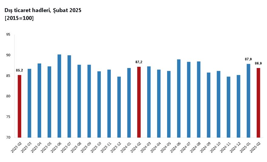 İthalat birim değer endeksi, bir önceki yılın aynı ayına göre yüzde 3 arttı. Endeks bir önceki yılın aynı ayına göre, gıda, içecek ve tütünde yüzde 6,5 arttı, yakıtlarda yüzde 4,3 arttı, ham maddelerde (yakıt hariç) yüzde 5 azaldı, imalat sanayinde (gıda, içecek, tütün hariç) yüzde 0,1 azaldı. İthalat miktar endeksi, bir önceki yılın aynı ayına göre yüzde 0,5 azaldı. Endeks bir önceki yılın aynı ayına göre, gıda, içecek ve tütünde yüzde 8,7 arttı, ham maddelerde (yakıt hariç) yüzde 2,3 arttı, yakıtlarda yüzde 1,4 arttı, imalat sanayinde (gıda, içecek, tütün hariç) yüzde 4,4 azaldı. İhracat birim değer endeksinin ithalat birim değer endeksine bölünmesi ile hesaplanan dış ticaret haddi, bir önceki yılın aynı ayına göre 0,3 puan azalarak 2025 yılı Şubat ayında 86,9 oldu.