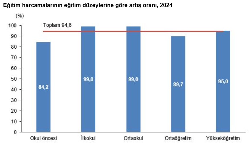 TÜİK, 2024 yılı eğitim harcamaları istatistiklerini açıkladı. Buna göre; eğitim harcamaları 2023 yılına göre yüzde 94,6 artarak 2 trilyon 200 milyar 338 milyon TL oldu. Bir önceki yıla göre harcamaların en fazla arttığı eğitim düzeyleri yüzde 99 ile ilkokul ve ortaokul oldu. Eğitim harcamalarının gayrisafi yurt içi hasıla içindeki payı 2023 yılında yüzde 4,2 iken, 2024 yılında yüzde 4,9 oldu. Devlet eğitim harcamalarının gayrisafi yurt içi hasıla içindeki payı 2023 yılında yüzde 3,5 iken, 2024 yılında yüzde 4 oldu.