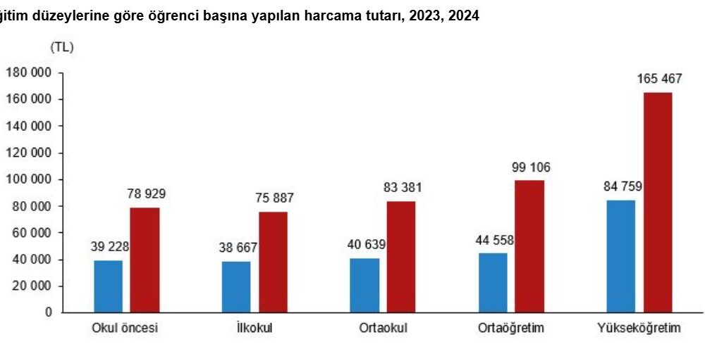 Öğrenci başına yapılan eğitim harcaması 2023 yılında 49 bin 45 TL iken, 2024 yılında 100 bin 307 TL olarak gerçekleşti. Eğitim düzeylerine göre değerlendirildiğinde, 2024 yılında öğrenci başına harcamanın en yüksek olduğu eğitim düzeyi 165 bin 467 TL ile yükseköğretim oldu. Öğrenci başına toplam eğitim harcaması 2024 yılında bir önceki yıla göre dolar bazında yüzde 48,1 artarak 3 bin 53 dolar oldu.