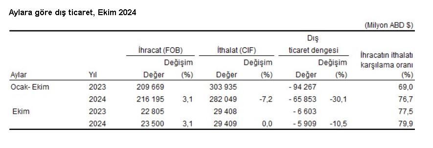 TÜİK, Ekim 2024 dönemine ilişkin dış ticaret istatistiklerini açıkladı. Buna göre; ihracat bir önceki yılın aynı ayına göre yüzde 3,1 artarak 23 milyar 500 milyon dolar, ithalat aynı kalarak 29 milyar 409 milyon dolar olarak gerçekleşti. 2024 yılı Ocak-Ekim döneminde bir önceki yılın aynı dönemine göre yüzde 3,1 artarak 216 milyar 195 milyon dolar, ithalat yüzde 7,2 azalarak 282 milyar 49 milyon dolar olarak gerçekleşti.