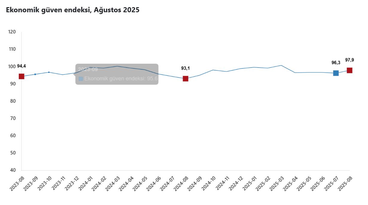 TÜİK, Ağustos 2025 dönemine ilişkin ekonomik güven endeksi verilerini açıkladı. Buna göre; ekonomik güven endeksi temmuz ayında 96,3 iken, ağustos ayında yüzde 1,7 oranında artarak 97,9 değerini aldı. Bir önceki aya göre ağustos ayında tüketici güven endeksi yüzde 0,9 oranında artarak 84,3 değerini, reel kesim güven endeksi yüzde 1,7 oranında artarak 100,6 değerini, hizmet sektörü güven endeksi yüzde 1,1 oranında artarak 111,1 değerini, perakende ticaret sektörü güven endeksi yüzde 0,8 oranında artarak 108,8 değerini, inşaat sektörü güven endeksi yüzde 4,0 oranında azalarak 85,3 değerini aldı.