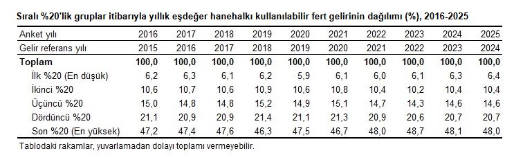 TÜİK, 2025 yılına ilişkin gelir dağılımı istatistiklerini açıkladı. Buna göre; Türkiyede en yüksek eşdeğer hanehalkı kullanılabilir fert gelirine sahip yüzde 20lik grubun toplam gelirden aldığı pay bir önceki yıla göre 0,1 puan azalarak yüzde 48 olurken en düşük gelire sahip yüzde 20lik grubun aldığı pay ise 0,1 puan artarak yüzde 6,4 oldu.