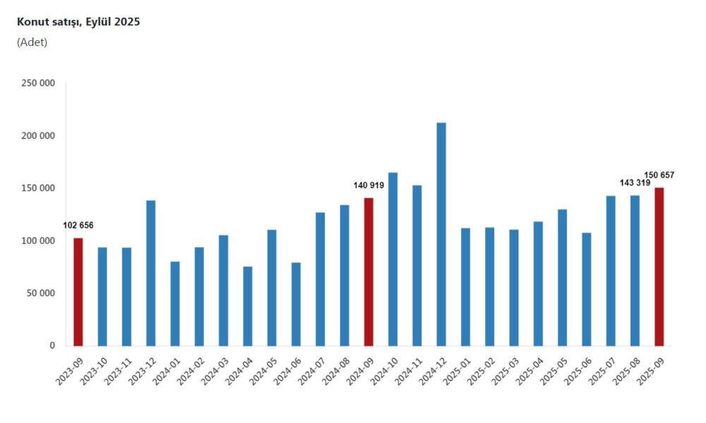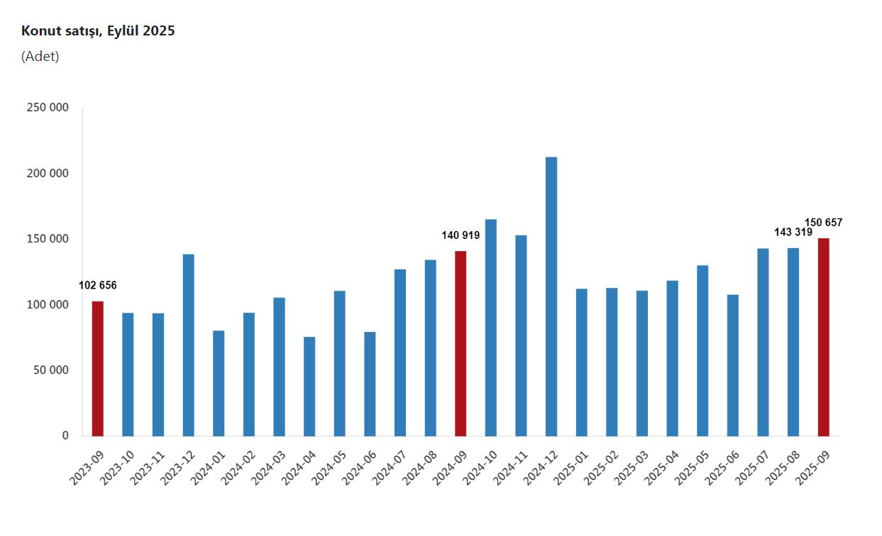 TÜİK, Eylül 2025 dönemine ilişkin konut satış istatistiklerini açıkladı. Buna göre; Türkiye genelinde konut satışları eylül ayında bir önceki yılın aynı ayına göre yüzde 6,9 oranında artarak 150 bin 657 oldu. Konut satış sayısının en fazla olduğu iller sırasıyla 24 bin 119 ile İstanbul, 13 bin 417 ile Ankara ve 8 bin 544 ile İzmir olurken, en az olduğu iller sırasıyla 70 ile Ardahan, 117 ile Bayburt ve 142 ile Tunceli olarak gerçekleşti. Konut satışları ocak- eylül döneminde bir önceki yılın aynı dönemine göre yüzde 19,2 oranında artarak 1 milyon 128 bin 727 olarak gerçekleşti.