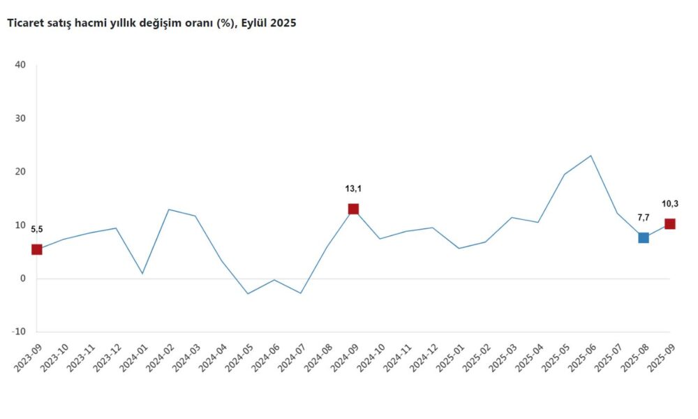 Ticaret satış hacmi 2025 yılı eylül ayında bir önceki yılın aynı ayına göre yüzde 10,3 arttı. Aynı ayda motorlu kara taşıtlarının ve motosikletlerin toptan ve perakende ticareti ile onarımı için satış hacmi yüzde 8,3, toptan ticaret satış hacmi yüzde 8,9, perakende ticaret satış hacmi yüzde 14,3 arttı. Ticaret satış hacmi, eylül ayında bir önceki aya göre yüzde 4,7 arttı. Aynı ayda motorlu kara taşıtlarının ve motosikletlerin toptan ve perakende ticareti ile onarımı için satış hacmi yüzde 0,4 azaldı; toptan ticaret satış hacmi yüzde 7, perakende ticaret satış hacmi yüzde 2,2 arttı.