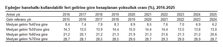 TÜİK, 2025 yılına ilişkin, Yoksulluk ve Yaşam Koşulları İstatistiklerini açıkladı. Eş değer hanehalkı kullanılabilir fert medyan gelirinin yüzde 50si dikkate alınarak belirlenen yoksulluk sınırına göre hesaplanan göreli yoksulluk oranı, 2025 yılında bir önceki yıla göre 0,6 puan azalarak yüzde 13 oldu. Medyan gelirin yüzde 60ı dikkate alınarak belirlenen yoksulluk sınırına göre hesaplanan yoksulluk oranı ise yine 0,6 puan azalarak yüzde 20,6 olarak gerçekleşti. Eş değer hanehalkı kullanılabilir fert medyan gelirinin yüzde 40ı dikkate alınarak belirlenen yoksulluk sınırına göre yoksulluk oranı, bir önceki yıla göre 0,7 puanlık azalış ile yüzde 6,2 olarak gerçekleşti. Medyan gelirin yüzde 70i dikkate alınarak belirlenen yoksulluk sınırına göre hesaplanan yoksulluk oranı ise bir önceki yıla göre 0,2 puanlık azalış ile yüzde 28,7 oldu.