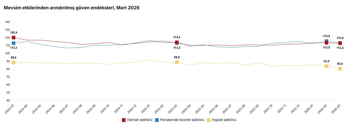 TÜİK, Mart 2026 dönemine ilişkin hizmet, perakende ticaret ve inşaat güven endekslerini açıkladı. Buna göre; mevsim etkilerinden arındırılmış güven endeksi mart ayında bir önceki aya göre; hizmet sektöründe yüzde 0,5 oranında azalarak 113,2 değerini aldı. Perakende ticaret sektöründe yüzde 2 oranında azalarak 113,6 olan güven endeksi, inşaat sektöründe de yüzde 3,9 oranında azalarak 80,6 değerini aldı.