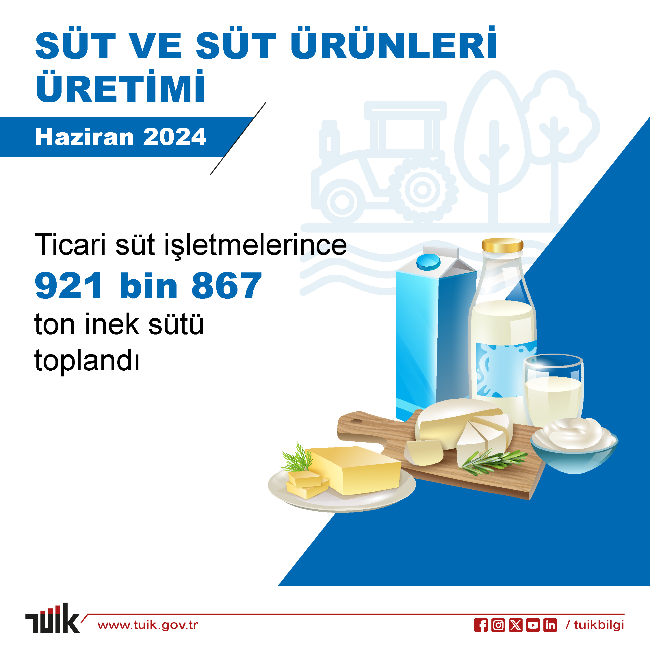 Haziranda ticari süt işletmeleri tarafından toplanan inek sütü miktarı bir önceki yılın aynı ayına göre yüzde 6,4 artarak 921 bin 867 ton oldu. İnek sütü miktarı, ocak-haziran döneminde ise bir önceki yılın aynı dönemine göre yüzde 8,1 arttı. Haziran ayında bir önceki yılın aynı ayına göre, inek peyniri üretimi yüzde 3, içme sütü üretimi yüzde 7,8 azalırken; ayran üretimi yüzde 9, yoğurt üretimi yüzde 10,1 ve tereyağı üretimi yüzde 3,6 arttı. Ocak-haziran döneminde ise bir önceki yılın aynı dönemine göre, inek peyniri üretimi yüzde 5,7, ayran üretimi yüzde 14,7, yoğurt üretimi yüzde 10, içme sütü üretimi yüzde 2,3, tereyağı üretimi yüzde 12,3 arttı.