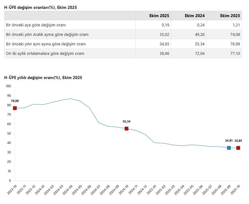 TÜİK, Ekim 2025 dönemine ilişkin hizmet üretici fiyat endeksi verilerini açıkladı. Buna göre, hizmet üretici fiyatları, ekim ayında bir önceki aya göre yüzde 0,19, bir önceki yılın aralık ayına göre yüzde 35,02, bir önceki yılın aynı ayına göre yüzde 34,85 ve 12 aylık ortalamalara göre yüzde 38,96 arttı.