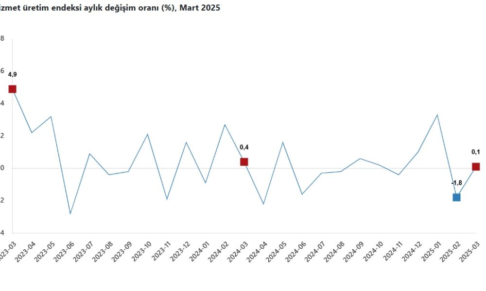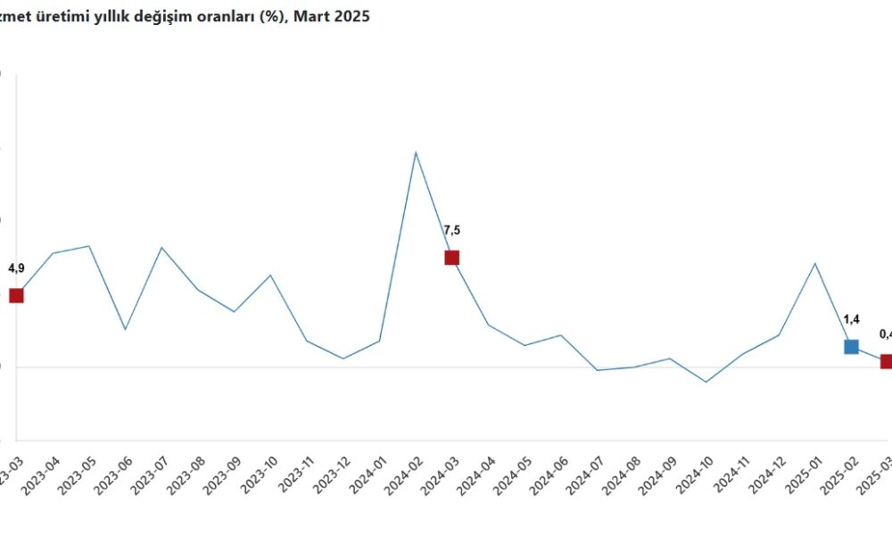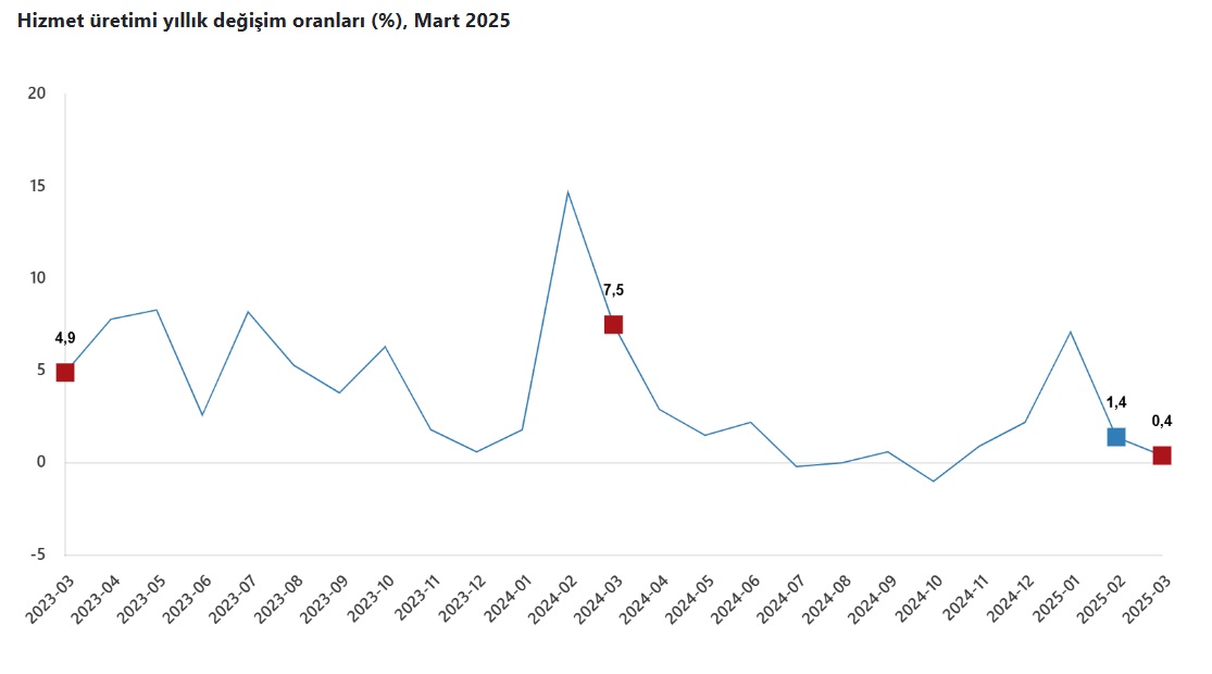 TÜİK, Mart 2025 dönemine ilişkin hizmet üretim endeksi verilerini açıkladı. Buna göre; hizmet üretimi bir önceki yılın aynı ayına göre yüzde 0,4 arttı. Aynı ayda ulaştırma ve depolama hizmetleri yüzde 1,3 azaldı, konaklama ve yiyecek hizmetleri yüzde 2,5 azaldı, bilgi ve iletişim hizmetleri yüzde 6,3 arttı, gayrimenkul hizmetleri yüzde 3,3 azaldı, mesleki, bilimsel ve teknik hizmetler yüzde 3,7 arttı, idari ve destek hizmetleri ise yüzde 2,8 arttı.