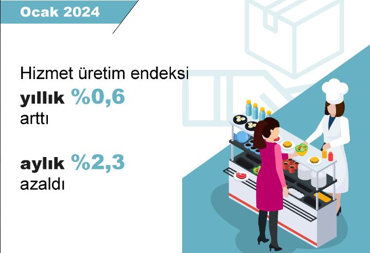TÜRKİYE İstatistik Kurumu (TÜİK), hizmet üretiminin ocak ayında yıllık yüzde 0,6 arttığını, aylık yüzde 2,3 azaldığını açıkladı.TÜİK, Ocak 2024 dönemine ilişkin hizmet üretim endeksi verilerini açıkladı. Buna göre; hizmet üretim endeksi ocak ayında bir önceki yılın aynı ayına göre yüzde 0,6 arttı. Aynı ayda ulaştırma ve depolama hizmetleri yüzde 0,6 arttı, konaklama ve yiyecek hizmetleri yüzde 1,1 arttı, bilgi ve iletişim hizmetleri yüzde 4,9 arttı, gayrimenkul hizmetleri yüzde 8,6 azaldı, mesleki, bilimsel ve teknik hizmetler yüzde 6 arttı, idari ve destek hizmetleri ise yüzde 3,5 arttı.Hizmet üretim endeksi bir önceki aya göre de yüzde 2,3 azaldı. Aynı ayda ulaştırma ve depolama hizmetleri yüzde 7,2 azaldı, konaklama ve yiyecek hizmetleri yüzde 0,7 arttı, bilgi ve iletişim hizmetleri yüzde 3,4 arttı, gayrimenkul hizmetleri yüzde 0,4 azaldı, mesleki, bilimsel ve teknik hizmetler yüzde 4,1 arttı, idari ve destek hizmetleri ise yüzde 1,4 arttı.