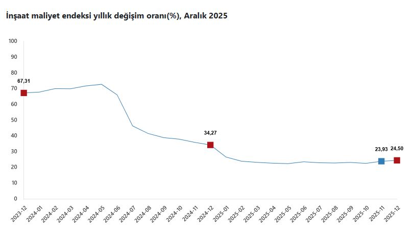 TÜİK, Aralık 2025 dönemine ilişkin inşaat maliyet endeksi verilerini açıkladı. Buna göre, inşaat maliyeti aralık ayında bir önceki aya göre yüzde 1,17 arttı, bir önceki yılın aynı ayına göre yüzde 24,50 arttı. Bir önceki aya göre malzeme endeksi yüzde 1,22 arttı, işçilik endeksi yüzde 1,06 arttı. Ayrıca bir önceki yılın aynı ayına göre malzeme endeksi yüzde 21,47 arttı, işçilik endeksi yüzde 30,67 arttı. Bina inşaatı maliyeti, bir önceki aya göre yüzde 1,52 arttı, bir önceki yılın aynı ayına göre yüzde 24,55 arttı. Bina dışı yapılar için inşaat maliyeti bir önceki aya göre yüzde 0,03 arttı, bir önceki yılın aynı ayına göre yüzde 24,37 arttı.
