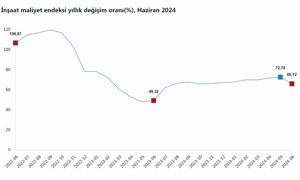 TÜİK, Haziran 2024 dönemine ilişkin inşaat maliyet endeksi verilerini açıkladı. Buna göre; inşaat maliyeti haziran ayında bir önceki aya göre yüzde 0,40, bir önceki yılın aynı ayına göre yüzde 66,12 arttı. Bir önceki aya göre, malzeme endeksi yüzde 1,01 arttı, işçilik endeksi ise yüzde 0,80 azaldı. Ayrıca bir önceki yılın aynı ayına göre, malzeme endeksi yüzde 51,55, işçilik endeksi yüzde 105,50 arttı.