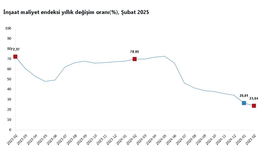 TÜİK, Şubat 2025 dönemine ilişkin inşaat maliyet endeksi verilerini açıkladı. Buna göre; inşaat maliyeti bir önceki aya göre yüzde 1,24, bir önceki yılın aynı ayına göre yüzde 23,94 arttı. Bir önceki aya göre malzeme endeksi yüzde 1,99 arttı, işçilik endeksi yüzde 0,02 azaldı. Ayrıca bir önceki yılın aynı ayına göre malzeme endeksi yüzde 19,49 arttı, işçilik endeksi yüzde 32,38 arttı. Bina inşaatı maliyeti, bir önceki aya göre yüzde 1,13, bir önceki yılın aynı ayına göre yüzde 24,44 arttı. Bina dışı yapılar için inşaat maliyeti ise bir önceki aya göre yüzde 1,59, bir önceki yılın aynı ayına göre yüzde 22,34 arttı.