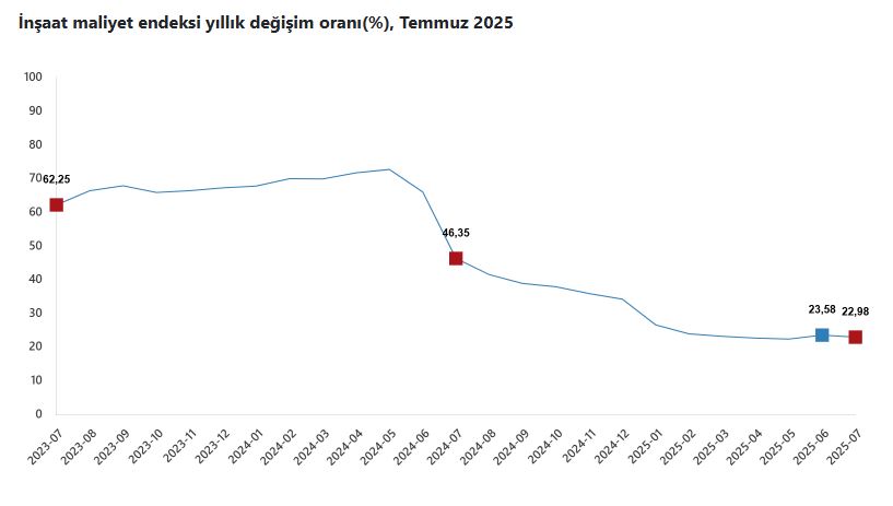 TÜİK, Temmuz 2025 dönemine ilişkin inşaat maliyet endeksi verilerini açıkladı. Buna göre; inşaat maliyeti temmuz ayında bir önceki aya göre yüzde 1,41, bir önceki yılın aynı ayına göre yüzde 22,98 arttı. Bir önceki aya göre malzeme endeksi yüzde 1,79, işçilik endeksi yüzde 0,72 arttı. Ayrıca bir önceki yılın aynı ayına göre malzeme endeksi yüzde 18,98, işçilik endeksi yüzde 31 arttı. Bina inşaatı maliyeti, bir önceki aya göre yüzde 1,21, bir önceki yılın aynı ayına göre yüzde 22,81 arttı. Bina dışı yapılar için inşaat maliyeti, bir önceki aya göre yüzde 2,06, bir önceki yılın aynı ayına göre yüzde 23,51 arttı.