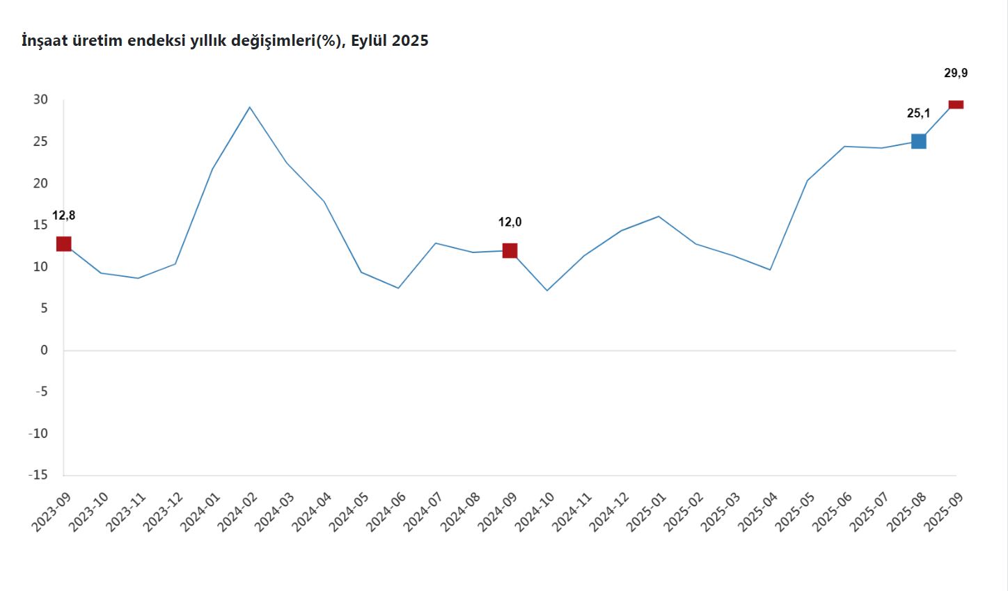 TÜİK, Eylül 2025 inşaat üretim endeksi verilerini açıkladı. Buna göre; inşaat üretimi, bir önceki yılın aynı ayına göre yüzde 29,9 arttı. İnşaatın alt sektörleri incelendiğinde, 2025 yılı Eylül ayında bina inşaatı sektörü endeksi bir önceki yılın aynı ayına göre yüzde 31,2 arttı, bina dışı yapıların inşaatı sektörü endeksi yüzde 23,3 arttı ve özel inşaat faaliyetleri sektörü endeksi yüzde 30,1 arttı.