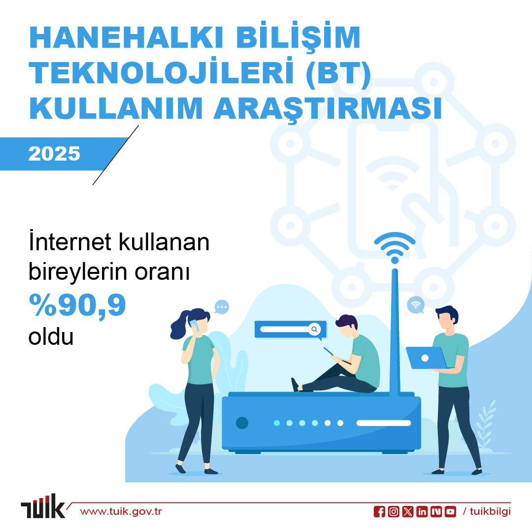 TÜİK, 2025 yılına ilişkin Hane Halkı Bilişim Teknolojileri Kullanım Araştırması sonuçlarını açıkladı. Buna göre; internet kullanım oranı, 16-74 yaş grubundaki bireylerde 2024 yılında yüzde 88,8 iken 2025 yılında yüzde 90,9 oldu. Cinsiyet ayrımında 2025 yılında internet kullanım oranı; erkeklerde yüzde 93,6, kadınlarda yüzde 88,2 olarak gözlendi. Son 12 ay içinde özel amaçla resmi makamların web sitelerini ve uygulamalarını kullanan ve internet üzerinden kamu hizmetlerinden yararlanan bireylerin oranı yüzde 76,1 oldu. Bu oran, erkeklerde yüzde 82,8 iken kadınlarda yüzde 69,5 olarak gerçekleşti. E-devlet hizmetlerini kullanan bireylerin oranı yaş grubuna göre incelendiğinde ise bu oranın en yüksek yüzde 92,8 ile 25-34 yaş grubunda, en düşük yüzde 29,6 ile 65-74 yaş grubunda olduğu görüldü. Bireylerin e-devlet hizmetlerini kullanım amaçları arasında, yüzde 68,5 ile resmi makamlar veya kamu hizmetleri tarafından kendisi hakkında saklanan kişisel bilgilere erişme ilk sırayı aldı. Bunu, yüzde 53,6 ile kamu kurumlarından veya kamu hizmetlerinden bir randevu alma veya rezervasyon yaptırma ve yüzde 46,4 ile kamu kuruluşlarına ait web sitelerinden bilgi edinme takip etti.