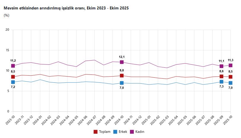 TÜİK, Ekim 2025 dönemine ilişkin iş gücü istatistiklerini açıkladı. Buna göre; 15 ve daha yukarı yaştaki kişilerde işsiz sayısı 2025 yılı Ekim ayında bir önceki aya göre 27 bin kişi azalarak 3 milyon 33 bin kişi oldu. İşsizlik oranı 0,1 puan azalarak yüzde 8,5 seviyesinde gerçekleşti. İşsizlik oranı erkeklerde yüzde 7 iken kadınlarda yüzde 11,3 kaydedildi. İstihdam edilenlerin sayısı 2025 yılı Ekim ayında bir önceki aya göre 185 bin kişi artarak 32 milyon 772 bin kişi, istihdam oranı 0,2 puan artarak yüzde 49,2 oldu. Bu oran erkeklerde yüzde 66,5 iken kadınlarda yüzde 32,4 olarak gerçekleşti. İş gücü, 2025 yılı Ekim ayında bir önceki aya göre 157 bin kişi artarak 35 milyon 804 bin kişi, iş gücüne katılma oranı ise 0,2 puan artarak yüzde 53,8 olarak gerçekleşti. İş gücüne katılma oranı erkeklerde yüzde 71,5 iken kadınlarda yüzde 36,5 oldu.