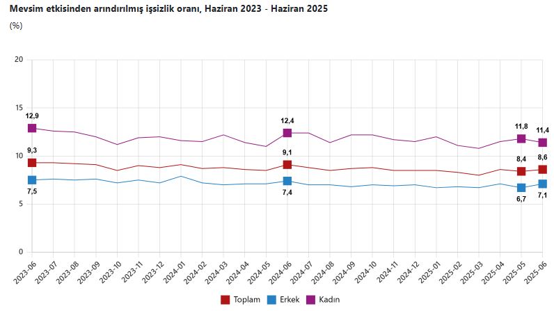 TÜİK, Haziran 2025 dönemine ilişkin iş gücü istatistiklerini açıkladı. Buna göre; 15 ve daha yukarı yaştaki kişilerde işsiz sayısı, 2025 yılı Haziran ayında bir önceki aya göre 52 bin kişi artarak 3 milyon 47 bin kişi oldu. İşsizlik oranı ise 0,2 puan artarak yüzde 8,6 seviyesinde gerçekleşti. İşsizlik oranı erkeklerde yüzde 7,1, kadınlarda yüzde 11,4 oldu.