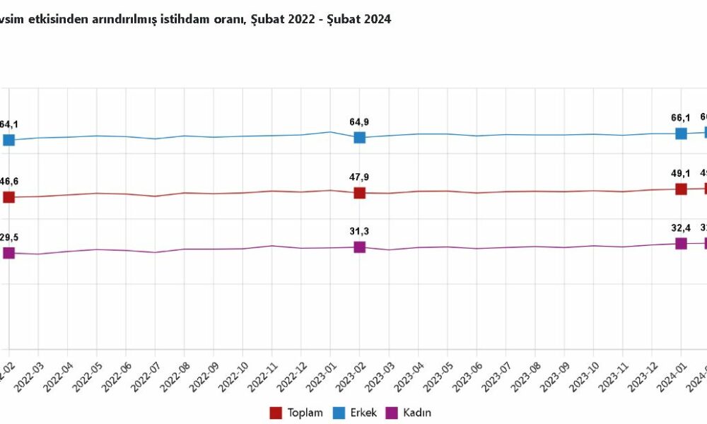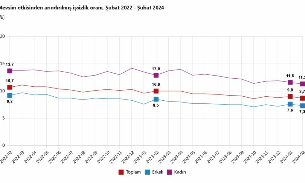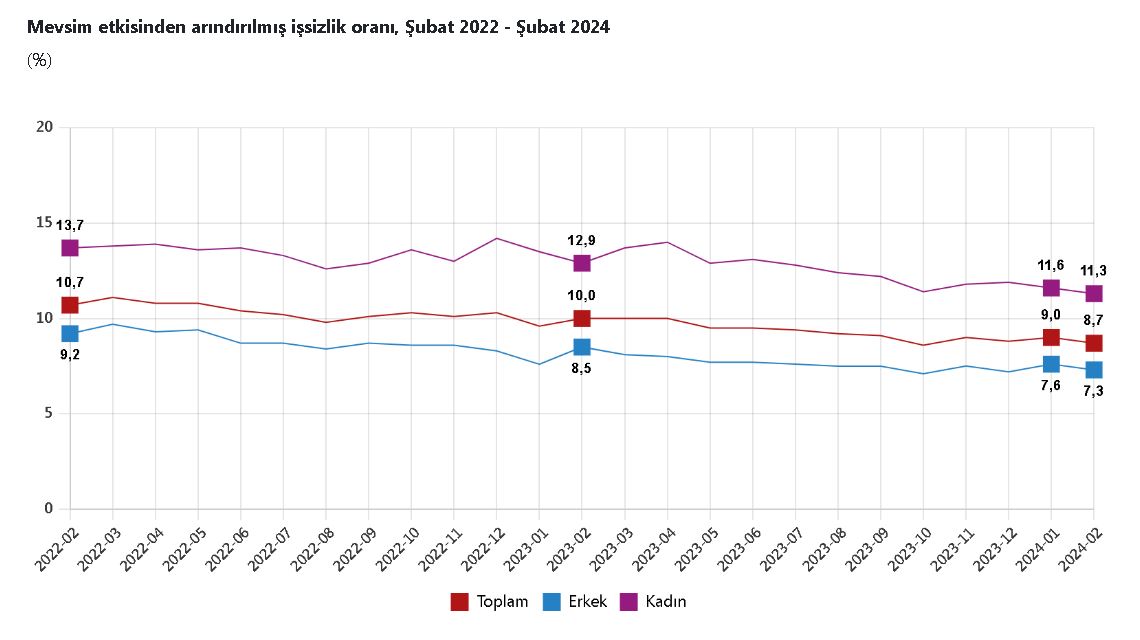 TÜRKİYE İstatistik Kurumu (TÜİK), şubat ayında işsizlik oranının 0,3 puan azalarak yüzde 8,7 seviyesinde gerçekleştiğini açıkladı. TÜİK, Şubat 2024 dönemine ilişkin iş gücü istatistiklerini açıkladı. Buna göre; 15 ve daha yukarı yaştaki kişilerde işsiz sayısı şubat ayında bir önceki aya göre 109 bin kişi azalarak 3 milyon 78 bin kişi oldu. İşsizlik oranı da 0,3 puan azalarak yüzde 8,7 seviyesinde gerçekleşti. İşsizlik oranı erkeklerde yüzde 7,3, kadınlarda yüzde 11,3 oldu.İSTİHDAM ORANI YÜZDE 49,3 İstihdam edilenlerin sayısı, 2024 yılı Şubat ayında bir önceki aya göre 147 bin kişi artarak 32 milyon 423 bin kişi, istihdam oranı 0,2 puan artarak yüzde 49,3 oldu. Bu oran erkeklerde yüzde 66,5, kadınlarda yüzde 32,5 kaydedildi. İş gücü şubat ayında bir önceki aya göre 38 bin kişi artarak 35 milyon 501 bin kişi, iş gücüne katılma oranı aynı seviyede kalarak yüzde 54 olarak gerçekleşti. İş gücüne katılma oranı erkeklerde yüzde 71,7, kadınlarda yüzde 36,6 oldu. 15-24 yaş grubunu kapsayan genç nüfusta işsizlik oranı, bir önceki aya göre 0,8 puan azalarak yüzde 15,6 oldu. Bu yaş grubunda işsizlik oranı, erkeklerde yüzde 13,4, kadınlarda yüzde 19,6 olarak gerçekleşti.HAFTALIK ORTALAMA FİİLİ ÇALIŞMA SÜRESİ 43,5 SAATİstihdam edilenlerden referans döneminde işbaşında olanların, mevsim ve takvim etkilerinden arındırılmış haftalık ortalama fiili çalışma süresi şubat ayında bir önceki aya göre 0,2 saat artarak 43,5 saat olarak gerçekleşti. Zamana bağlı eksik istihdam, potansiyel iş gücü ve işsizlerden oluşan atıl iş gücü oranı 2024 yılı Şubat ayında bir önceki aya göre 1,9 puan azalarak yüzde 24,5 oldu. Zamana bağlı eksik istihdam ve işsizlerin bütünleşik oranı yüzde 16,3 iken; işsiz ve potansiyel iş gücünün bütünleşik oranı yüzde 17,6 olarak gerçekleşti.