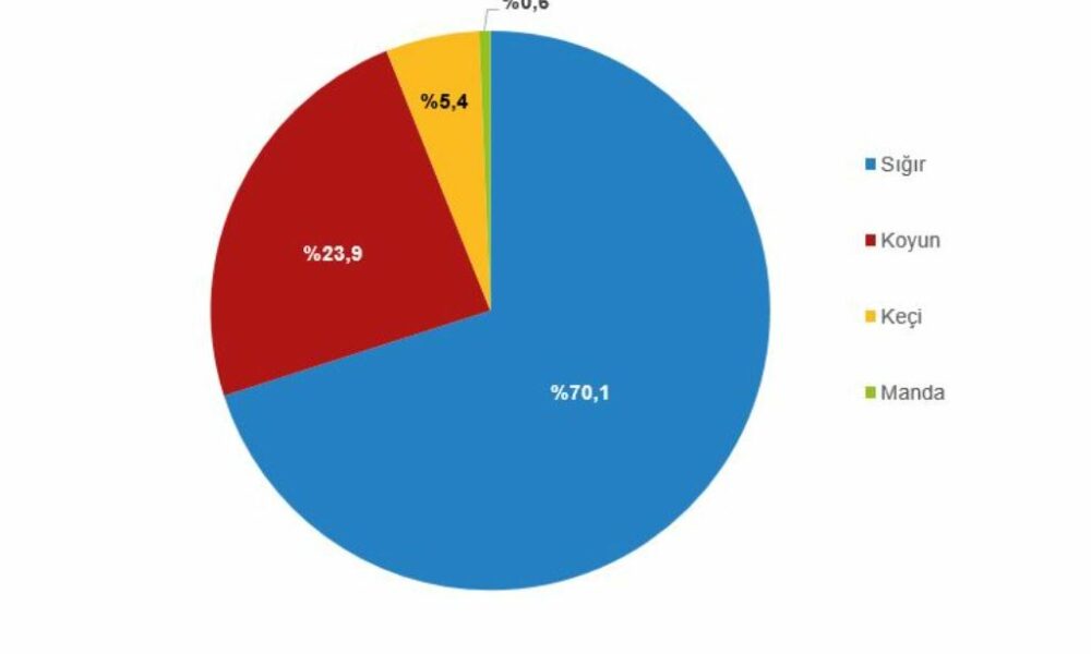 TÜİK, 2023 yılına ilişkin kırmızı et ve çiğ süt üretim istatistiklerini açıkladı. Buna göre; 2022 yılında 2 milyon 191 bin 625 ton olan kırmızı et üretimi, 2023 yılında yüzde 8,8 artarak 2 milyon 384 bin 47 ton oldu. Bir önceki yıla göre, sığır eti üretimi yüzde 6,2 artarak 1 milyon 670 bin 606 ton, koyun eti üretimi yüzde 16,3 artarak 569 bin 66 ton, keçi eti üretimi yüzde 11,3 artarak 128 bin 989 ton, manda eti üretimi ise yüzde 13,3 artarak 15 bin 386 ton olarak gerçekleşti. Ayrıca, 2023 yılında kırmızı et üretiminin yüzde 70,1ini sığır eti, yüzde 23,9unu koyun eti, yüzde 5,4ünü keçi eti ve yüzde 0,6sını manda eti oluşturdu.