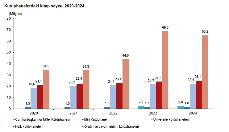 TÜİK, 2024 yılına ilişkin kütüphane istatistiklerini açıkladı. Buna göre; kütüphane sayısı 2024 yılında 1 Cumhurbaşkanlığı Millet Kütüphanesi, 1 Milli Kütüphane, 1301 halk kütüphanesi, 637 üniversite kütüphanesi ile 42 bin 889 örgün ve yaygın eğitim kurum kütüphanesi olmak üzere toplam 44 bin 829 oldu. Kitap sayısı, 117 milyon 172 bin 954 oldu. Cumhurbaşkanlığı Millet Kütüphanesi kitap sayısı 2024 yılında yüzde 3,2 artarak 2 milyon 613 bin 965 oldu. Bir önceki yıla göre kitap sayıları Milli Kütüphanede yüzde 8,3 artarak 1 milyon 829 bin 534, üniversite kütüphanelerinde yüzde 3,5 artarak 22 milyon 420 bin 99, halk kütüphanelerinde yüzde 3,6 artarak 25 milyon 82 bin 260, örgün ve yaygın eğitim kurum kütüphanelerinde yüzde 5,4 azalarak 65 milyon 227 bin 96 oldu.