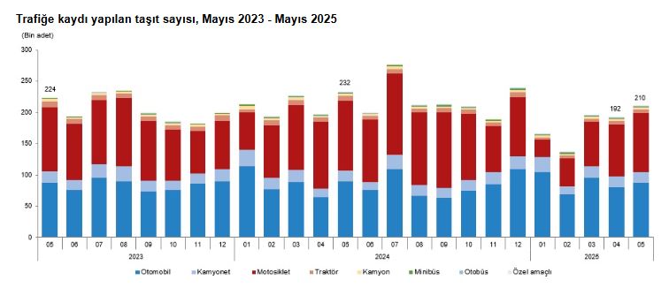 TÜİK, Mayıs 2025 dönemine ilişkin motorlu kara taşıtları istatistiklerini açıkladı. Buna göre; trafiğe kaydı yapılan taşıt sayısı bir önceki aya göre yüzde 9,5 artarak 210 bin 295 oldu. Mayıs ayında trafiğe kaydı yapılan taşıtların yüzde 44,8ini motosiklet, yüzde 41,4ünü otomobil, yüzde 8,5ini kamyonet, yüzde 2,6sını traktör, yüzde 1,6sını kamyon, yüzde 0,7sini minibüs, yüzde 0,3ünü otobüs ve yüzde 0,1ini özel amaçlı taşıtlar oluşturdu. Mayıs ayında trafiğe kaydı yapılan taşıt sayısı bir önceki aya göre motosiklette yüzde 12,8, otomobilde yüzde 8,4, traktörde yüzde 5,9, otobüste yüzde 5,1, kamyonette yüzde 3,3, kamyonda yüzde 3,1 artarken, özel amaçlı taşıtta yüzde 28,8 ve minibüste yüzde 5,9 azaldı.