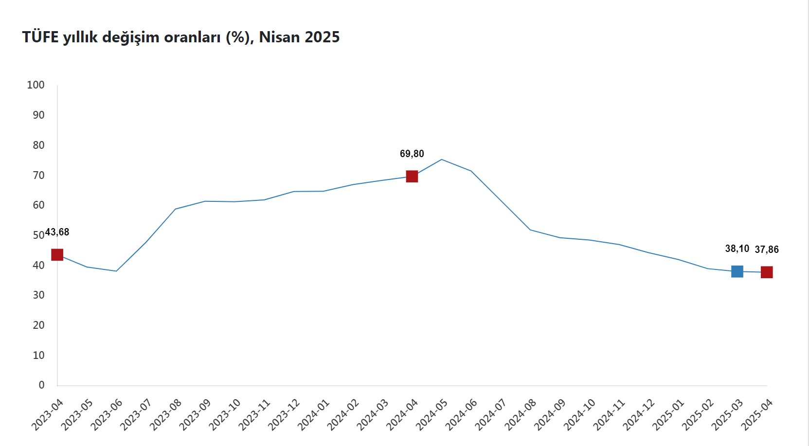 TÜİK, Nisan 2025 dönemine ilişkin enflasyon verilerini açıkladı. Buna göre; tüketici fiyatları bir önceki aya göre yüzde 3, bir önceki yılın aralık ayına göre yüzde 13,36, bir önceki yılın aynı ayına göre yüzde 37,86 ve 12 aylık ortalamalara göre yüzde 48,73 arttı.