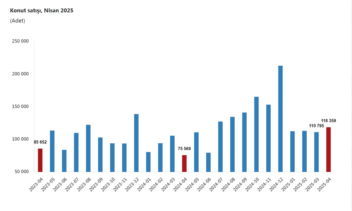 TÜİK, Nisan 2025 dönemine ilişkin konut satış istatistiklerini açıkladı. Buna göre; Türkiye genelinde konut satışları nisan ayında bir önceki yılın aynı ayına göre yüzde 56,6 oranında artarak 118 bin 359 oldu. Konut satış sayısının en fazla olduğu iller sırasıyla 18 bin 645 ile İstanbul, 10 bin 889 ile Ankara ve 7 bin 14 ile İzmir olurken, en az olduğu iller sırasıyla 37 ile Ardahan, 75 ile Tunceli ve 88 ile Bayburt olarak gerçekleşti. Konut satışları ocak-nisan döneminde bir önceki yılın aynı dönemine göre yüzde 27,9 oranında artarak 454 bin 145 olarak gerçekleşti.
