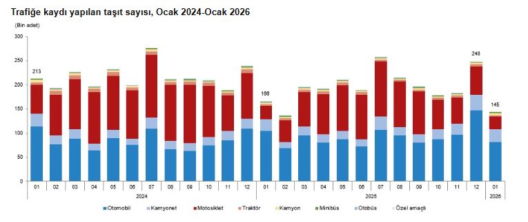 TÜİK, Ocak 2026 dönemine ilişkin motorlu kara taşıtları istatistiklerini açıkladı. Buna göre; ocak ayında 144 bin 620 adet taşıtın trafiğe kaydı yapıldı. Ocak ayında trafiğe kaydı yapılan taşıtların yüzde 56,1ini otomobil, yüzde 18,7sini motosiklet, yüzde 18,4ünü kamyonet, yüzde 3,3ünü kamyon, yüzde 1,3ünü minibüs, yüzde 1,3ünü traktör, yüzde 0,6sını otobüs ve yüzde 0,3ünü özel amaçlı taşıtlar oluşturdu. Trafiğe kaydı yapılan taşıt sayısı, bir önceki aya göre yüzde 41,7 azaldı. Ocak ayında trafiğe kaydı yapılan taşıt sayısı bir önceki aya göre kamyonda yüzde 59, otobüste yüzde 36,4, minibüste yüzde 34 artarken traktörde yüzde 62,6, motosiklette yüzde 53,7, otomobilde yüzde 44,9, kamyonette yüzde 17 ve özel amaçlı taşıtta yüzde 12,2 azaldı. Trafiğe kaydı yapılan taşıt sayısı geçen yılın aynı ayına göre de yüzde 12,7 azaldı. Ocak ayında geçen yılın aynı ayına göre trafiğe kaydı yapılan taşıt sayısı özel amaçlı taşıtta yüzde 186,3, otobüste yüzde 38,2, kamyonda yüzde 24,5, kamyonette yüzde 9,5, minibüste yüzde 9,1 artarken traktörde yüzde 41, otomobilde yüzde 22,3 ve motosiklette yüzde 2 azaldı.