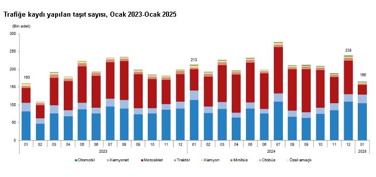TÜİK, Ocak 2025 dönemine ilişkin motorlu kara taşıtları istatistiklerini açıkladı. Buna göre; ocak ayında trafiğe kaydı yapılan taşıt sayısı bir önceki aya göre yüzde 30,7, bir önceki yılın aynı ayına göre yüzde 22,4 azalışla 165 bin 734 oldu. Trafiğe kaydı yapılan taşıtların yüzde 62,9unu otomobil, yüzde 16,7sini motosiklet, yüzde 14,7sini kamyonet, yüzde 2,3ünü kamyon, yüzde 1,9unu traktör, yüzde 1ini minibüs, yüzde 0,4ünü otobüs ve yüzde 0,1ini özel amaçlı taşıtlar oluşturdu.