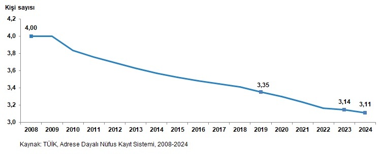 TÜİK, 15-21 Mayıs Aile Haftasına özel olarak İstatistiklerle Aile, 2024 bültenini yayımladı. Buna göre; Türkiyede 2008 yılında 4 kişi olan ortalama hane halkı büyüklüğü, azalma eğilimi göstererek 2024 yılında 3,11 kişiye düştü. 2024 yılında ortalama hanehalkı büyüklüğünün en yüksek olduğu il 4,85 kişi ile Şırnak oldu. Şırnakı 4,63 kişi ile Şanlıurfa ve 4,50 kişi ile Batman izledi. Ortalama hanehalkı büyüklüğünün en düşük olduğu iller ise 2,53 kişi ile Giresun ve Çanakkale oldu. Bu illeri, 2,55 kişi ile Tunceli ve 2,59 kişi ile Eskişehir izledi.