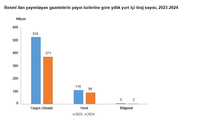 TÜİK, 2024 yılına ilişkin süreli yayın istatistiklerini açıkladı. Buna göre; 2024 yılında resmi ilan yayımlayan gazete sayısı bir önceki yıla göre yüzde 11,9 azalarak 753 oldu. Bu yayınların yüzde 95,9unu yerel, yüzde 3,1ini yaygın (ulusal), yüzde 1,1ini ise bölgesel yayınlar oluşturdu. 2024 yılında resmi ilan yayımlayan gazetelerin yıllık toplam tirajı ise 2023 yılına göre yüzde 27,5 azalarak 462 milyon 707 bin 383 oldu. Tirajın yüzde 80,1ini yaygın (ulusal) gazeteler oluşturdu.