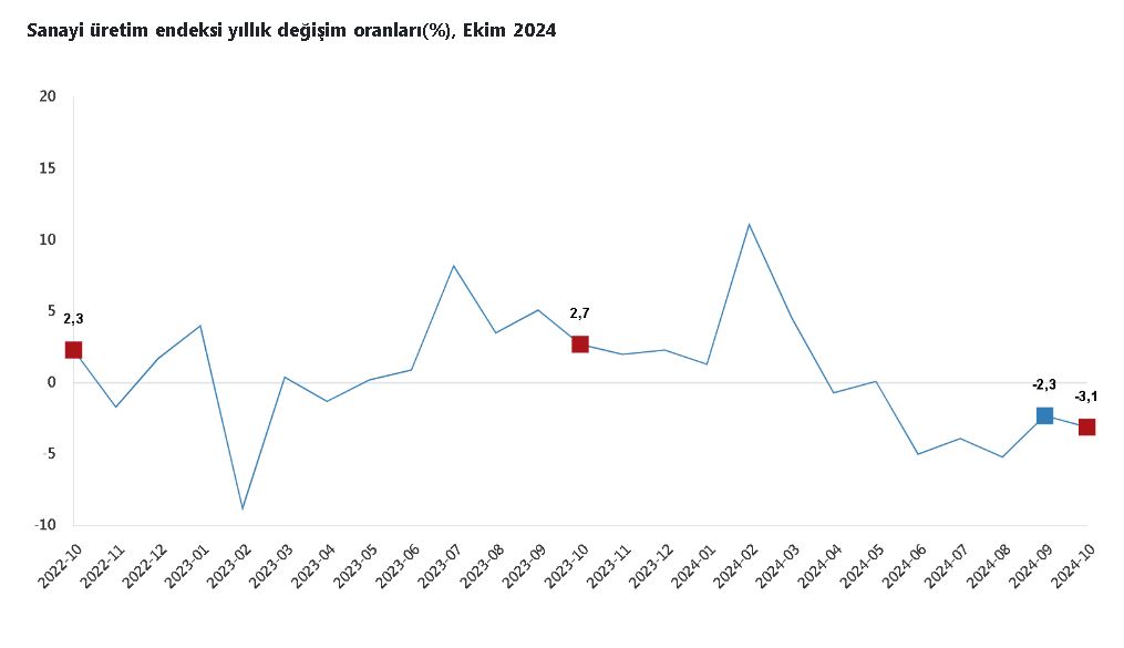TÜİK, Ekim 2024 dönemine ilişkin sanayi üretim endeksi verilerini açıkladı. Buna göre; sanayi üretimi bir önceki yılın aynı ayına göre yüzde 3,1 azaldı. Sanayinin alt sektörleri incelendiğinde, madencilik ve taş ocakçılığı sektörü endeksi bir önceki yılın aynı ayına göre yüzde 14,2 azaldı, imalat sanayi sektörü endeksi yüzde 3,3 azaldı ve elektrik, gaz, buhar ve iklimlendirme üretimi ve dağıtımı sektörü endeksi yüzde 7,6 arttı.