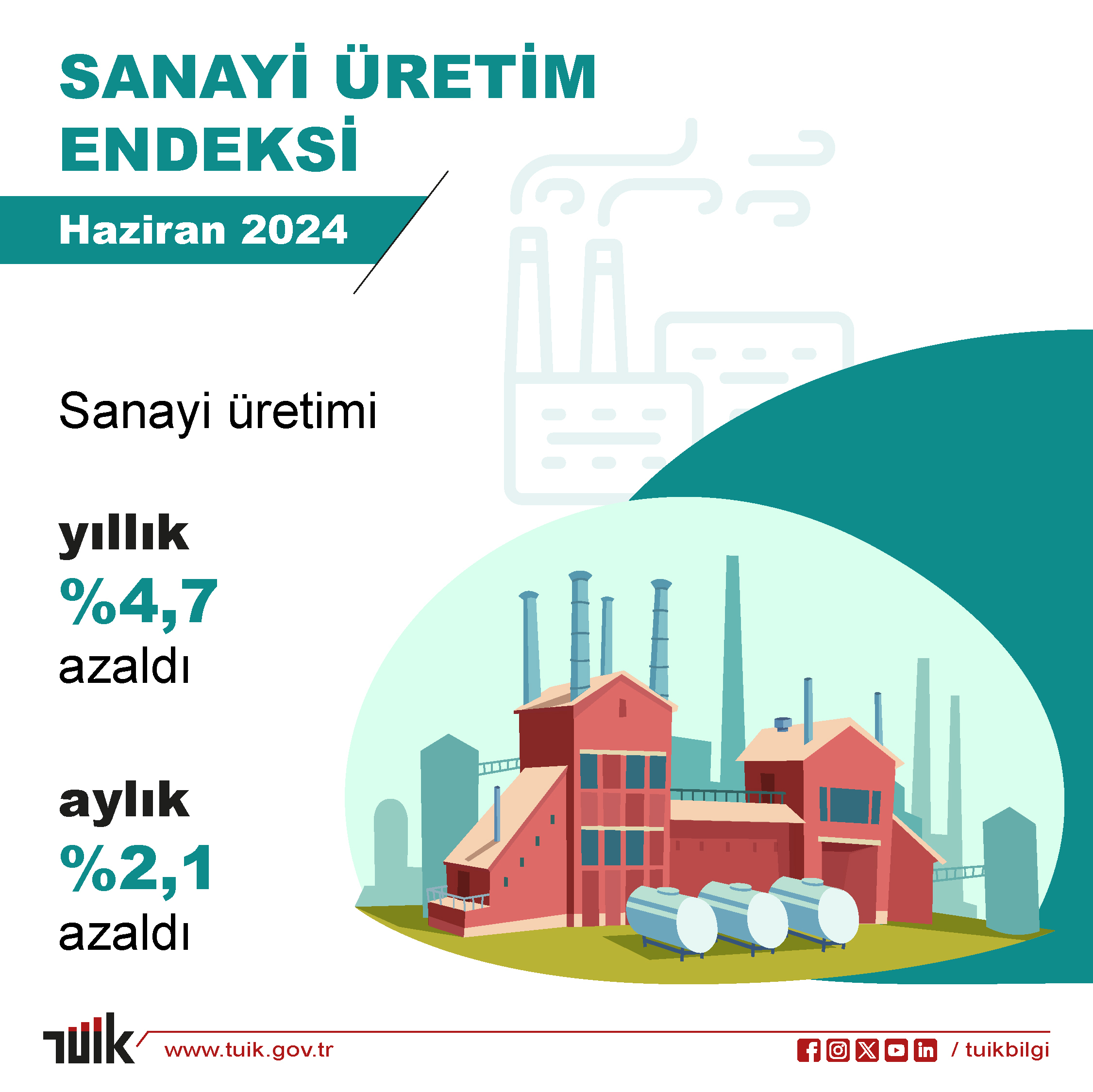 TÜİK 2024 yılı haziran ayına ilişkin sanayi üretim endeksi verilerini açıkladı. Buna göre; sanayi üretimi haziran ayında, bir önceki yılın aynı ayına göre yüzde 4,7 azaldı. Sanayinin alt sektörleri incelendiğinde, madencilik ve taş ocakçılığı sektörü endeksi bir önceki yılın aynı ayına göre yüzde 8,6 arttı, imalat sanayi sektörü endeksi yüzde 6,9 azaldı ve elektrik, gaz, buhar ve iklimlendirme üretimi ve dağıtımı sektörü endeksi yüzde 15,2 arttı.