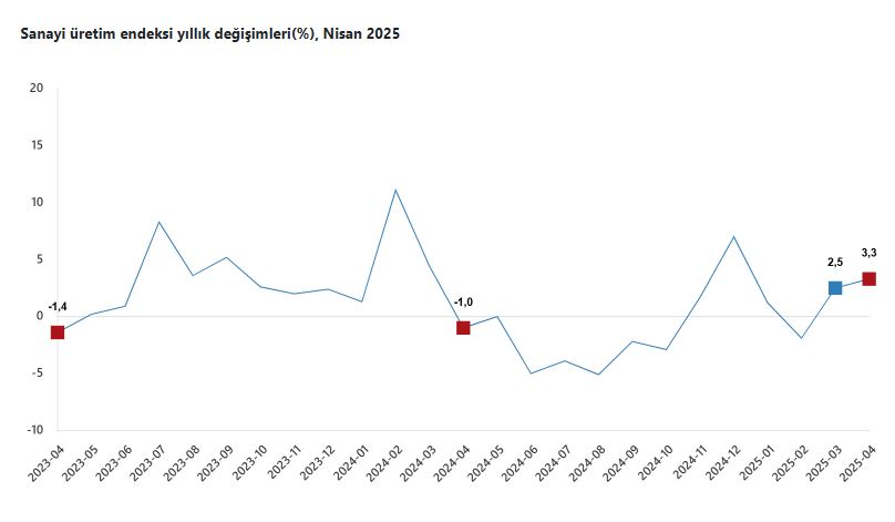 TÜİK, Nisan 2025 dönemine ilişkin sanayi üretim endeksi verilerini açıkladı. Buna göre; sanayi üretimi bir önceki yılın aynı ayına göre yüzde 3,3 arttı. Sanayinin alt sektörleri incelendiğinde, madencilik ve taş ocakçılığı sektörü endeksi bir önceki yılın aynı ayına göre yüzde 1,3 arttı, imalat sanayi sektörü endeksi yüzde 3 arttı ve elektrik, gaz, buhar ve iklimlendirme üretimi ve dağıtımı sektörü endeksi yüzde 8,8 arttı.