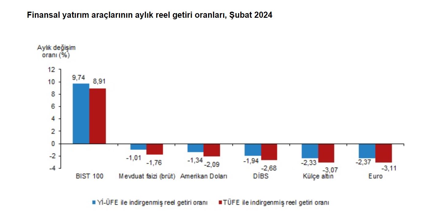 TÜRKİYE İstatistik Kurumu (TÜİK), şubat ayında yatırımcısına en yüksek reel getiriyi sağlayan finansal yatırım aracının BIST 100 endeksi olduğunu açıkladı.TÜİK, Şubat 2024 dönemine ilişkin finansal yatırım araçlarının reel getiri oranlarını açıkladı. Buna göre; aylık en yüksek reel getiri, yurt içi üretici fiyat endeksi (Yİ-ÜFE) ile indirgendiğinde yüzde 9,74, tüketici fiyat endeksi (TÜFE) ile indirgendiğinde ise yüzde 8,91 oranlarıyla BIST 100 endeksinde gerçekleşti. Yİ-ÜFE ile indirgendiğinde; yatırım araçlarından mevduat faizi (brüt) yüzde 1,01, dolar yüzde 1,34, Devlet İç Borçlanma Senetleri (DİBS) yüzde 1,94, külçe altın yüzde 2,33 ve euro yüzde 2,37 oranlarında yatırımcısına kaybettirdi. TÜFE ile indirgendiğinde mevduat faizi (brüt) yüzde 1,76, dolar yüzde 2,09, DİBS yüzde 2,68, külçe altın yüzde 3,07 ve euro yüzde 3,11 oranlarında yatırımcısına kaybettirdi.3 VE 6 AYLIK DEĞERLENDİRMEBIST 100 endeksi, 3 aylık değerlendirmede; Yİ-ÜFE ile indirgendiğinde yüzde 6,02, TÜFE ile indirgendiğinde ise yüzde 0,91 oranlarında yatırımcısına en yüksek reel getiri sağlayan yatırım aracı oldu. Aynı dönemde euro, Yİ-ÜFE ile indirgendiğinde yüzde 1,76, TÜFE ile indirgendiğinde ise yüzde 6,50 oranlarında yatırımcısına en çok kaybettiren yatırım aracı oldu.Altı aylık değerlendirmeye göre külçe altın; Yİ-ÜFE ile indirgendiğinde yüzde 3,38 oranında yatırımcısına en yüksek reel getiri sağlarken; TÜFE ile indirgendiğinde ise yüzde 4,72 oranında yatırımcısına kaybettirdi. Aynı dönemde DİBS, Yİ-ÜFE ile indirgendiğinde yüzde 21,66, TÜFE ile indirgendiğinde ise yüzde 27,80 oranlarında yatırımcısına en çok kaybettiren yatırım aracı oldu.YILLIK EN YÜKSEK REEL GETİRİ BİST 100 ENDEKSİNDEFinansal yatırım araçları yıllık olarak değerlendirildiğinde BIST 100 endeksi; Yİ-ÜFE ile indirgendiğinde yüzde 24,45, TÜFE ile indirgendiğinde ise yüzde 9,71 oranlarında yatırımcısına en yüksek reel getiri sağlayan yatırım aracı oldu. Yıllık değerlendirmede, Yİ-ÜFE ile indirgendiğinde; yatırım araçlarından külçe altın yüzde 23,29, euro yüzde 11,66 ve dolar yüzde 10,87 oranlarında yatırımcısına reel getiri sağlarken; mevduat faizi (brüt) yüzde 22,26 ve DİBS yüzde 48,09 oranlarında yatırımcısına kaybettirdi. TÜFE ile indirgendiğinde külçe altın yüzde 8,70 oranında yatırımcısına reel getiri sağlarken; euro yüzde 1,56, dolar yüzde 2,26, mevduat faizi (brüt) yüzde 31,46 ve DİBS yüzde 54,23 oranlarında yatırımcısına kaybettirdi.