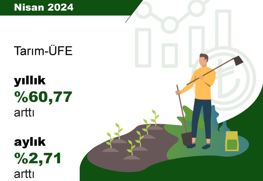 TÜİK, Nisan 2024 dönemine ilişkin tarım ürünleri üretici fiyat endeksi verilerini açıkladı. Buna göre; tarım ürünleri üretici fiyatları, nisan ayında bir önceki aya göre yüzde 2,71, bir önceki yılın aralık ayına göre yüzde 20,68, bir önceki yılın aynı ayına göre yüzde 60,77 ve 12 aylık ortalamalara göre yüzde 60,69 arttı.