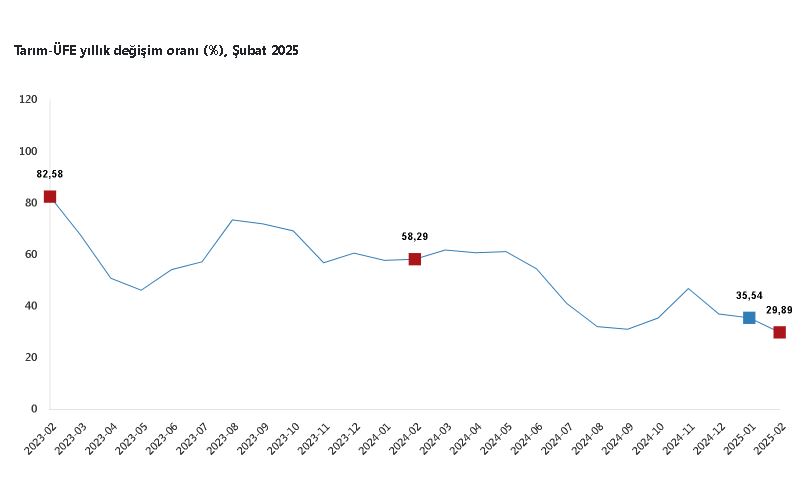 TÜİK, Şubat 2025 dönemine ilişkin tarım ürünleri üretici fiyat endeksi verilerini açıkladı. Buna göre; tarım ürünleri üretici fiyatları, bir önceki aya göre yüzde 2,70, bir önceki yılın aralık ayına göre yüzde 5,52, bir önceki yılın aynı ayına göre yüzde 29,89 ve 12 aylık ortalamalara göre yüzde 42,60 arttı.