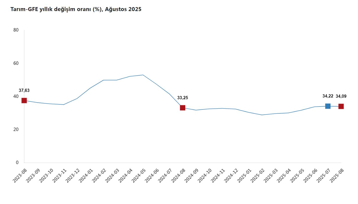 TÜİK, Ağustos 2025 dönemine ilişkin tarımsal girdi fiyat endeksi verilerini açıkladı. Buna göre; tarımsal girdi fiyatları, ağustos ayında bir önceki aya göre yüzde 1,30, bir önceki yılın aralık ayına göre yüzde 23,81, bir önceki yılın aynı ayına göre yüzde 34,09 ve 12 aylık ortalamalara göre yüzde 31,94 arttı. Ana gruplarda ise bir önceki aya göre, tarımda kullanılan mal ve hizmetler endeksinde yüzde 1,55 artış, tarımsal yatırıma katkı sağlayan mal ve hizmetler endeksinde yüzde 0,18 azalış gerçekleşti. Bir önceki yılın aynı ayına göre tarımda kullanılan mal ve hizmetler endeksinde yüzde 35,07 artış, tarımsal yatırıma katkı sağlayan mal ve hizmetler endeksinde yüzde 28,51 artış gerçekleşti. Yıllık değişimin en yüksek olduğu alt grup yüzde 59,79 artış ile veteriner harcamaları, aylık değişimin en yüksek olduğu alt grup yüzde 3,94 artış ile gübre ve toprak geliştiriciler oldu.