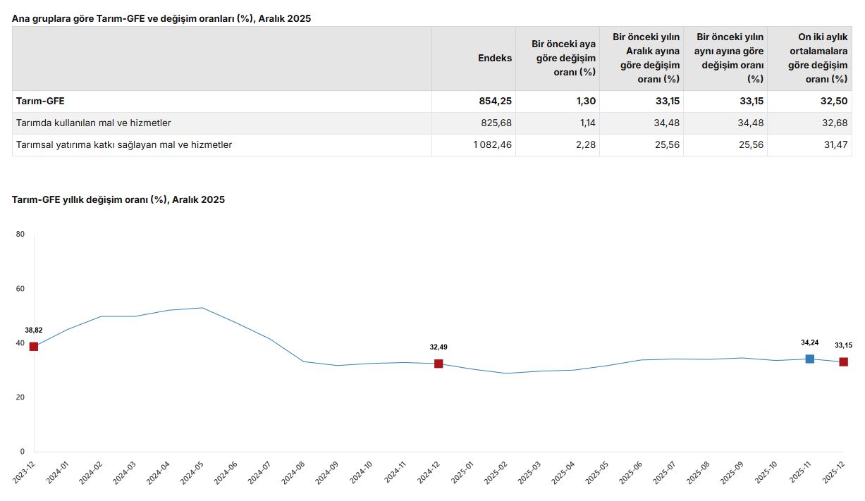 TÜİK, Aralık 2025 dönemine ilişkin tarımsal girdi fiyat endeksi verilerini açıkladı. Buna göre; tarımsal girdi fiyatları 2025 yılı Aralık ayında bir önceki aya göre yüzde 1,30, bir önceki yılın aynı ayına göre yüzde 33,15 ve 12 aylık ortalamalara göre yüzde 32,50 arttı. Ana gruplarda bir önceki aya göre, tarımda kullanılan mal ve hizmetler endeksinde yüzde 1,14 artış, tarımsal yatırıma katkı sağlayan mal ve hizmetler endeksinde yüzde 2,28 artış gerçekleşti. Bir önceki yılın aynı ayına göre tarımda kullanılan mal ve hizmetler endeksinde yüzde 34,48 artış, tarımsal yatırıma katkı sağlayan mal ve hizmetler endeksinde yüzde 25,56 artış gerçekleşti. Yıllık değişimin en yüksek olduğu alt grup yüzde 72,78 artış ile veteriner harcamaları, aylık değişimin en yüksek olduğu alt grup yüzde 6,43 artış ile veteriner harcamaları oldu.