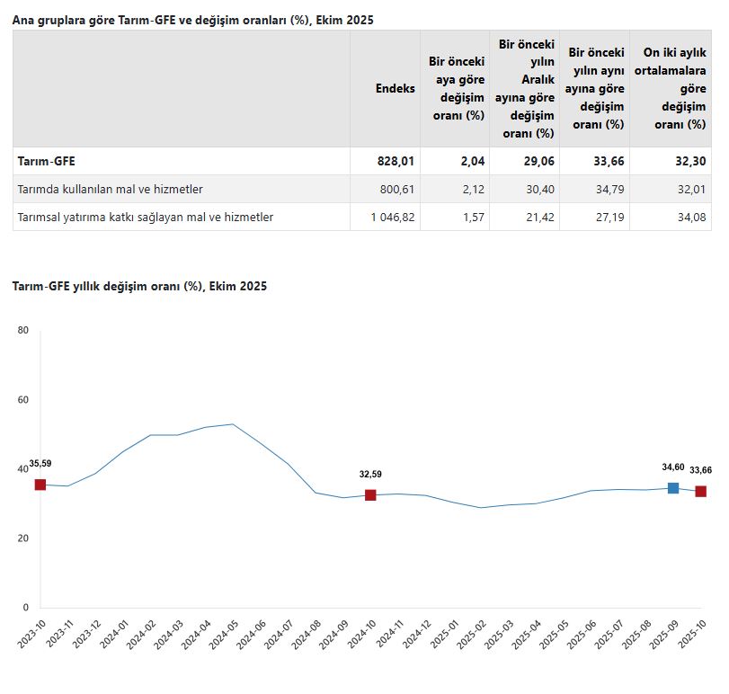 TÜİK, Ekim 2025 dönemine ilişkin tarımsal girdi fiyat endeksi verilerini açıkladı. Buna göre; tarımsal girdi fiyatları ekim ayında bir önceki aya göre yüzde 2,04, bir önceki yılın aralık ayına göre yüzde 29,06, bir önceki yılın aynı ayına göre yüzde 33,66 ve 12 aylık ortalamalara göre yüzde 32,30 arttı.