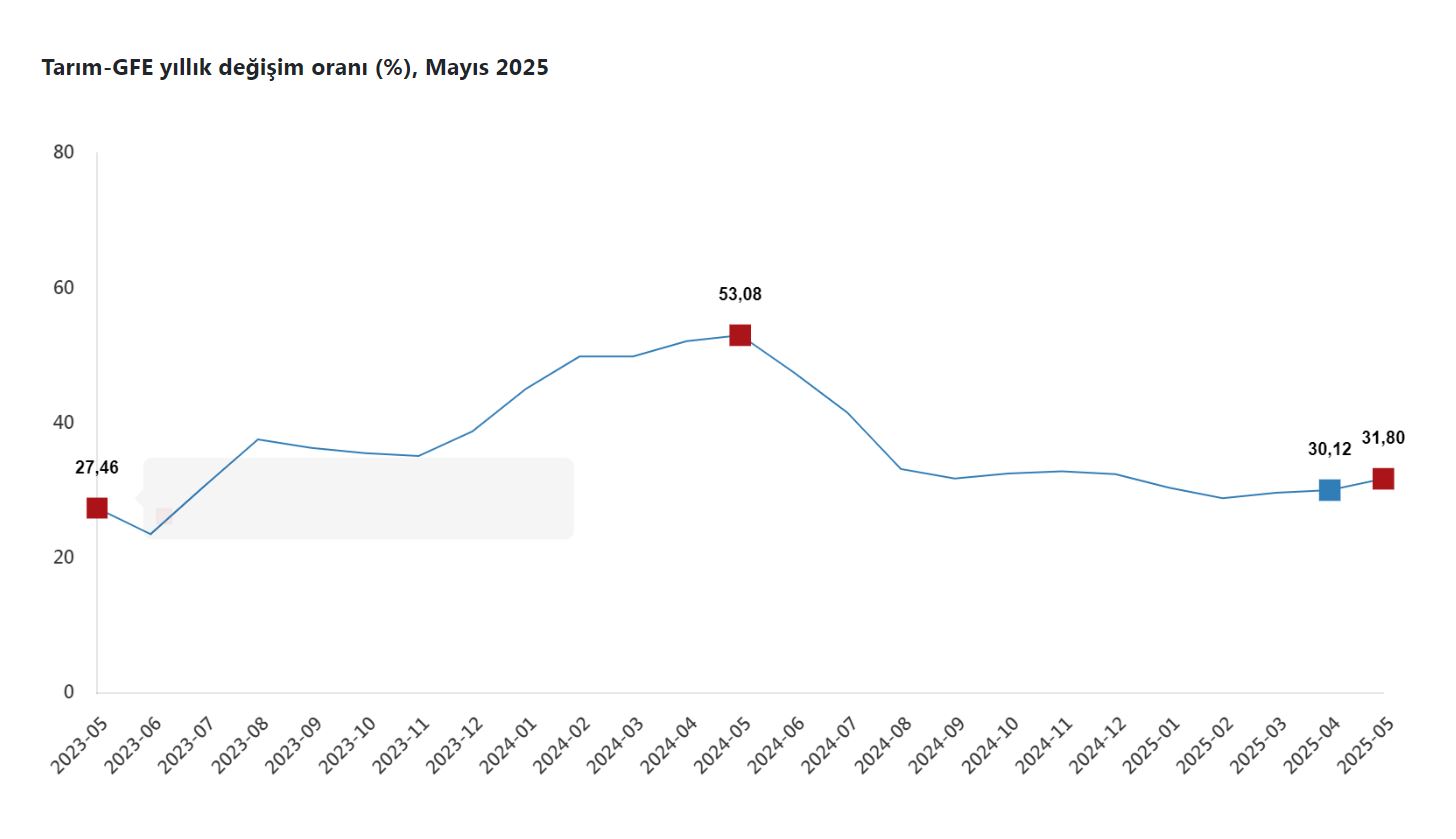 TÜİK, Mayıs 2025 dönemine ilişkin tarımsal girdi fiyat endeksi verilerini açıkladı. Buna göre; tarımsal girdi fiyatları bir önceki aya göre yüzde 2,15, bir önceki yılın aralık ayına göre yüzde 14,99, bir önceki yılın aynı ayına göre yüzde 31,80 ve 12 aylık ortalamalara göre yüzde 33,11 arttı. Ana gruplarda bir önceki aya göre, tarımda kullanılan mal ve hizmetler endeksinde yüzde 1,74 artış, tarımsal yatırıma katkı sağlayan mal ve hizmetler endeksinde yüzde 4,59 artış gerçekleşti. Bir önceki yılın aynı ayına göre tarımda kullanılan mal ve hizmetler endeksinde yüzde 31,08 artış, tarımsal yatırıma katkı sağlayan mal ve hizmetler endeksinde yüzde 36,12 artış gerçekleşti. Yıllık değişimin en yüksek olduğu alt grup yüzde 55,83 artış ile veteriner harcamaları, aylık değişimin en yüksek olduğu alt grup yüzde 5,10 artış ile malzemeler oldu.