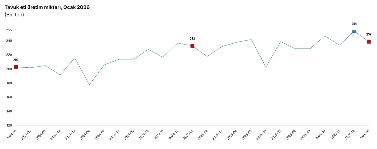 TÜİK, Ocak 2026 dönemine ilişkin kümes hayvancılığı ile süt ve süt ürünleri üretimi istatistiklerini açıkladı. Buna göre; ocak ayında bir önceki yılın aynı ayına göre, tavuk yumurtası üretimi yüzde 15,1 arttı, kesilen tavuk sayısı yüzde 3 arttı, tavuk eti üretimi yüzde 2,4 arttı.