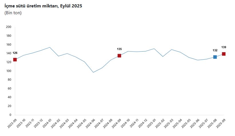Bir önceki ay 933 bin 234 ton olan ticari süt işletmelerince toplanan inek sütü miktarı eylül ayında yüzde 4,3 oranında azalarak 892 bin 886 ton oldu. Bir önceki ay 132 bin 359 ton olan içme sütü üretimi eylül ayında yüzde 4,8 oranında artarak 138 bin 726 ton olarak gerçekleşti. Ticari süt işletmeleri tarafından toplanan inek sütü miktarı, eylül ayında bir önceki yılın aynı ayına göre yüzde 1,7 azaldı, ocak-eylül döneminde bir önceki yılın aynı dönemine göre yüzde 0,3 arttı.