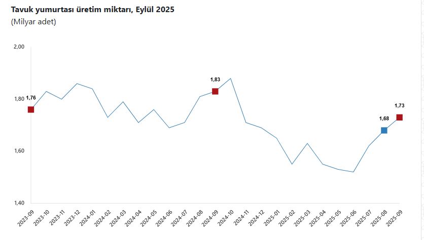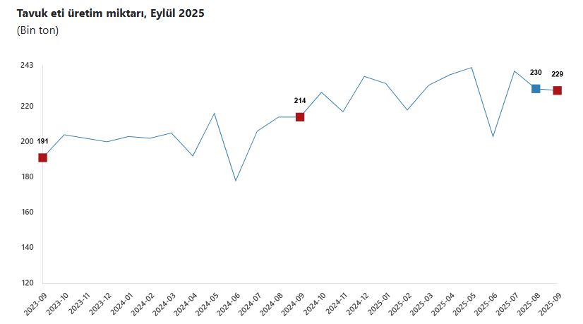 TÜİK, Eylül 2025 dönemine ilişkin kümes hayvancılığı ile süt ve süt ürünleri üretimi istatistiklerini açıkladı. Buna göre; bir önceki ay 229 bin 965 ton olan tavuk eti üretimi eylül ayında yüzde 0,5 oranında azalarak 228 bin 846 ton oldu. Bir önceki ay 1 milyar 679 milyon 706 bin adet olan tavuk yumurtası üretimi eylül ayında yüzde 3,1 oranında artarak 1 milyar 731 milyon 478 bin adet oldu. Eylül ayında bir önceki yılın aynı ayına göre, tavuk yumurtası üretimi yüzde 5,3 azaldı, kesilen tavuk sayısı yüzde 6,3 arttı, tavuk eti üretimi yüzde 6,9 arttı. Ocak-eylül döneminde bir önceki yılın aynı dönemine göre, tavuk yumurtası üretimi yüzde 8,9 azaldı, kesilen tavuk sayısı yüzde 10,3 arttı, tavuk eti üretimi yüzde 12,7 arttı.