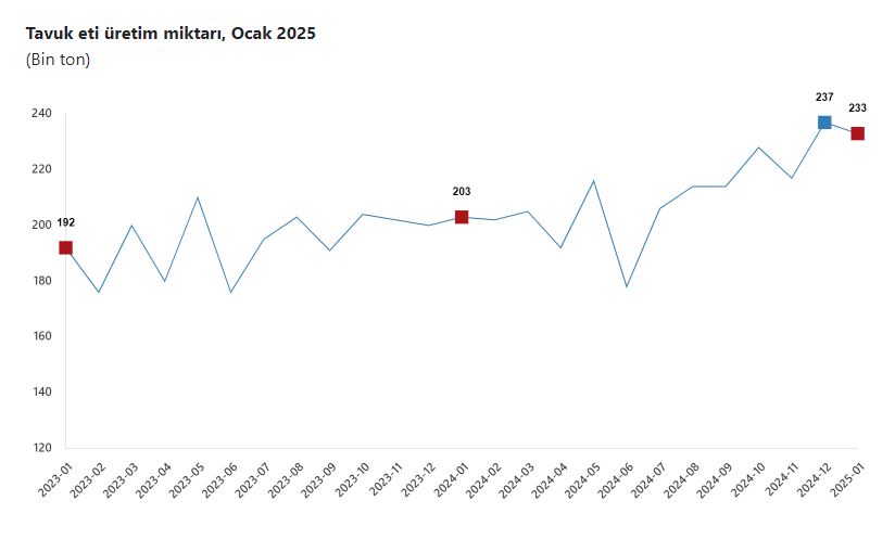 TÜİK, Ocak 2025 dönemine ilişkin kümes hayvancılığı ile süt ve süt ürünleri üretimi istatistiklerini açıkladı. Buna göre; bir önceki aya göre tavuk eti üretimi yüzde 1,7 azalarak 233 bin 223 ton, tavuk yumurtası üretimi yüzde 2,1 azalarak 1 milyar 652 milyon 615 bin adet oldu. Bir önceki yılın aynı ayına göre, tavuk yumurtası üretimi yüzde 10,1 azaldı, kesilen tavuk sayısı yüzde 11,8, tavuk eti üretimi yüzde 14,9 arttı.