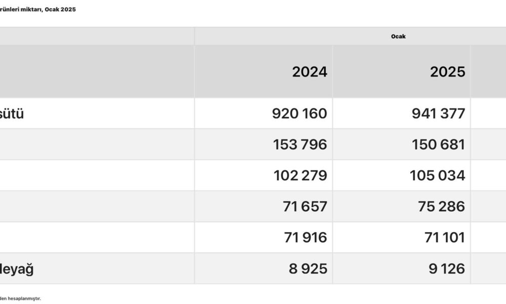 Ticari süt işletmeleri tarafından toplanan inek sütü miktarı, ocak ayında bir önceki yılın aynı ayına göre yüzde 2,3 arttı, inek peyniri üretimi yüzde 1,1 azaldı, ayran ve kefir üretimi yüzde 5,1 arttı, yoğurt üretimi yüzde 2,7 arttı, içme sütü üretimi yüzde 2 azaldı, tereyağı ve sadeyağ üretimi yüzde 2,3 arttı. Bir önceki ay 947 bin 109 ton olan ticari süt işletmelerince toplanan inek sütü miktarı ocak ayında yüzde 0,6 oranında azalarak 941 bin 377 ton oldu. Bir önceki ay 144 bin 891 ton olan içme sütü üretimi ocak ayında yüzde 4 oranında artarak 150 bin 681 ton olarak gerçekleşti.