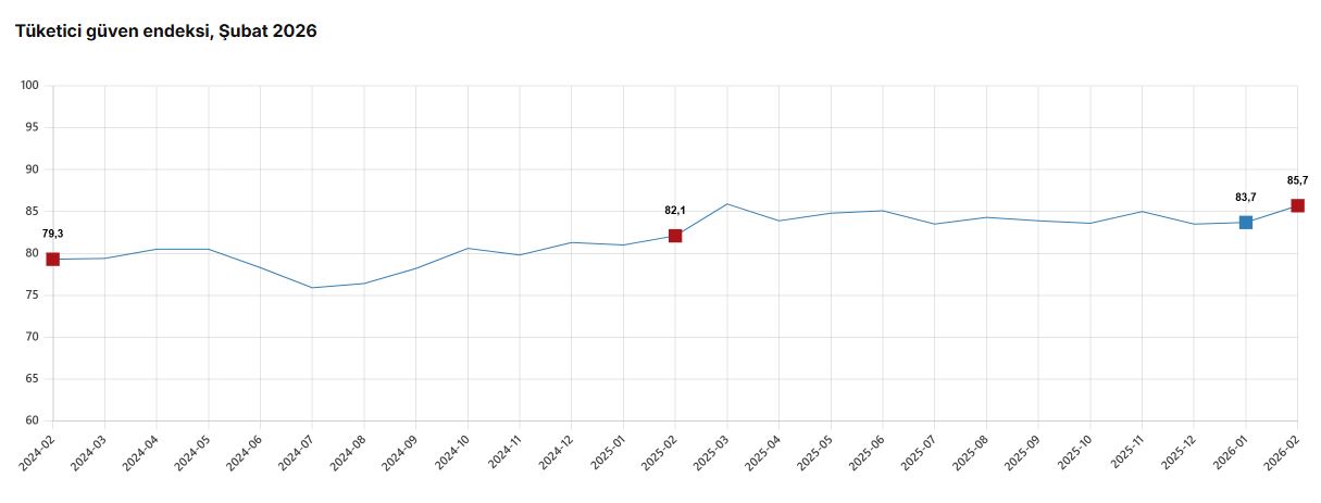 TÜİK, Şubat 2026 dönemine ilişkin tüketici güven endeksi verilerini açıkladı. Buna göre; tüketici güven endeksi, şubat ayında bir önceki aya göre yüzde 2,3 oranında artarak 85,7 oldu. Alt endekslerine bakıldığında; bir önceki aya göre mevcut dönemde hanenin maddi durumu endeksi 4,6 artarak 71,3, gelecek 12 aylık dönemde hanenin maddi durum beklentisi endeksi 4,2 artarak 86,8, gelecek 12 aylık dönemde genel ekonomik durum beklentisi endeksi 0,1 azalarak 81,4 ve gelecek 12 aylık dönemde dayanıklı tüketim mallarına harcama yapma düşüncesi endeksi 1,3 artarak 103,2 değerlerini aldı.